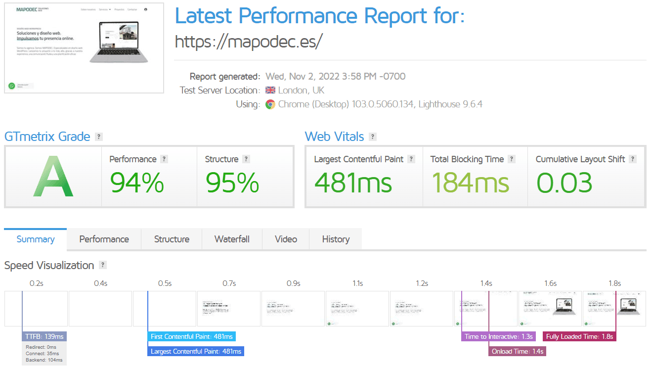 En esta imagen podéis observar los resultados de la web de MAPODEC en la plataforma de GTmetrix, dando unos valores muy positivos.